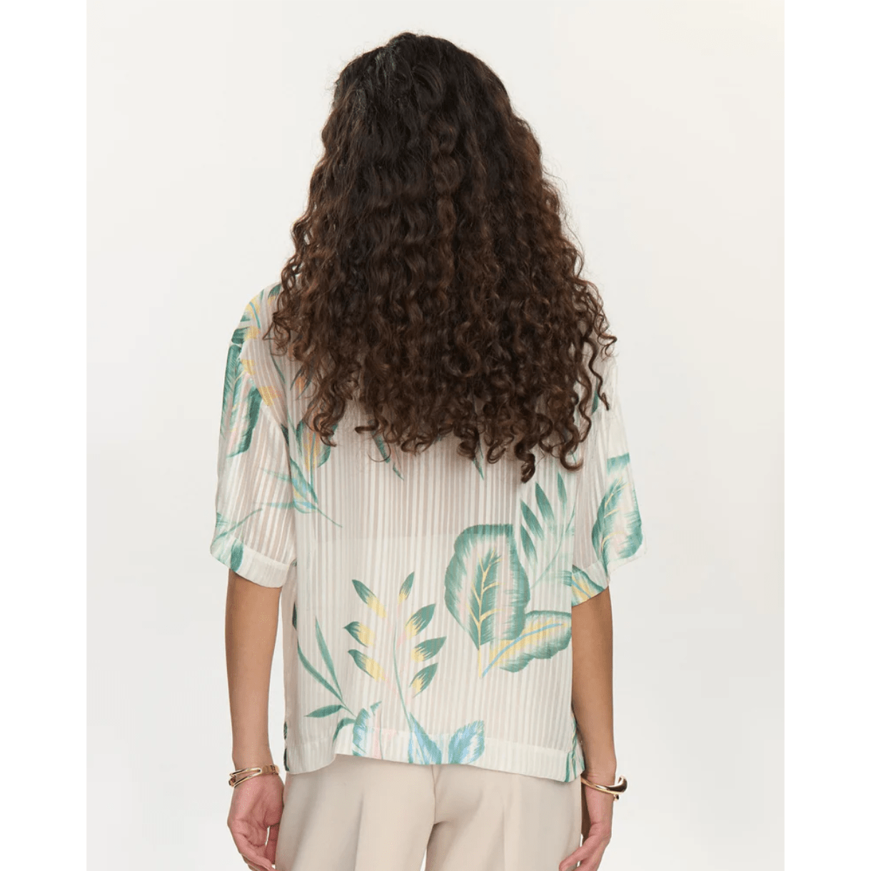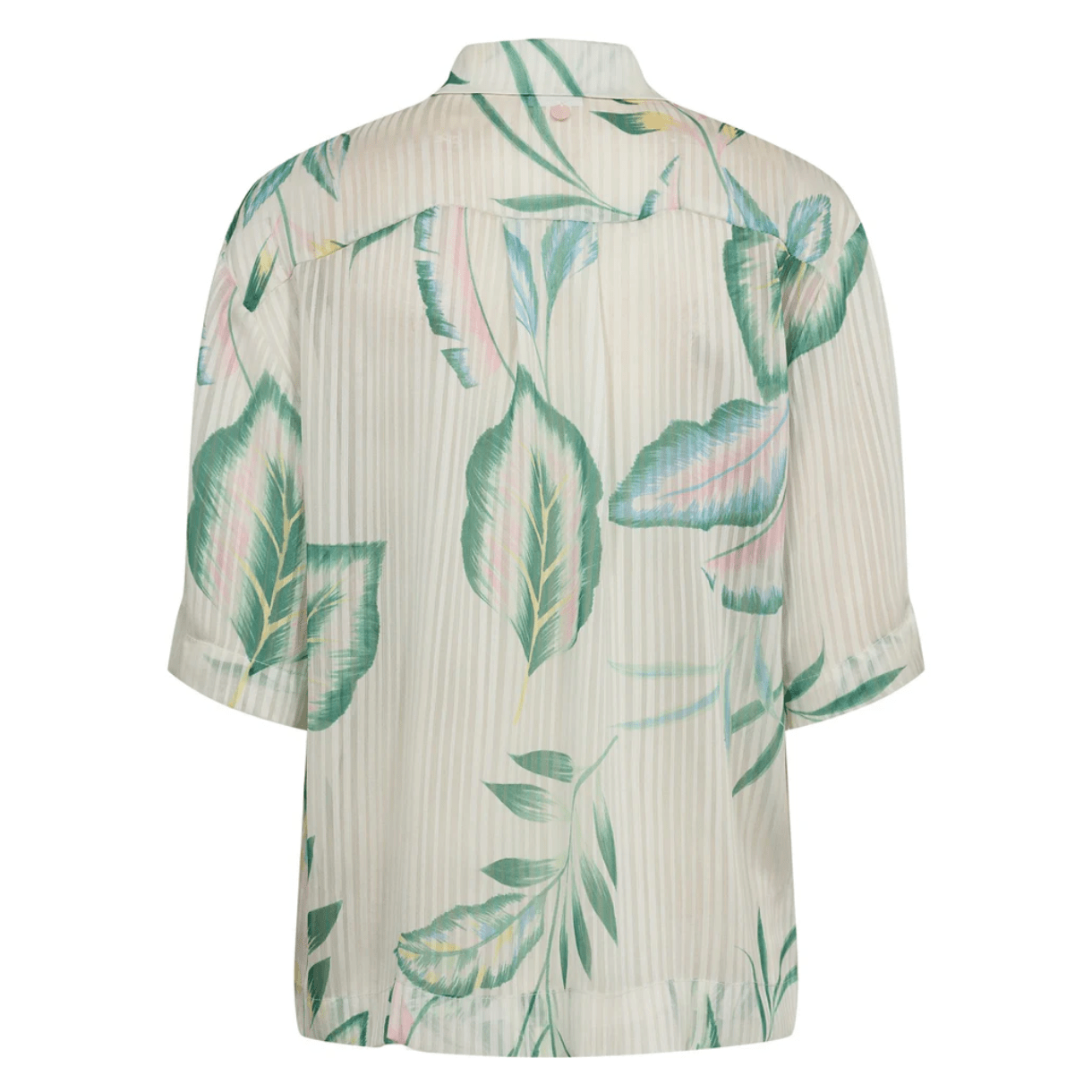 Skjorten har korte, brede ærmer, skjortekrave og er gennemknappet.