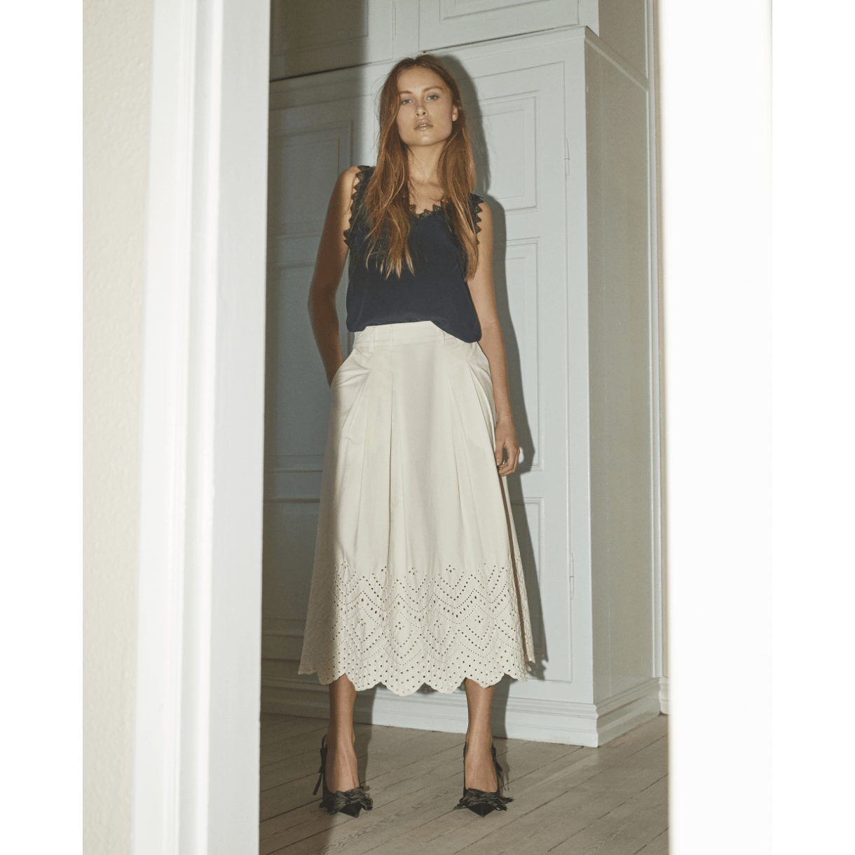 Toppen har V-udskæring og brede stropper med fin blonde både i ærmegab og rund i hals-/rygudskæring.