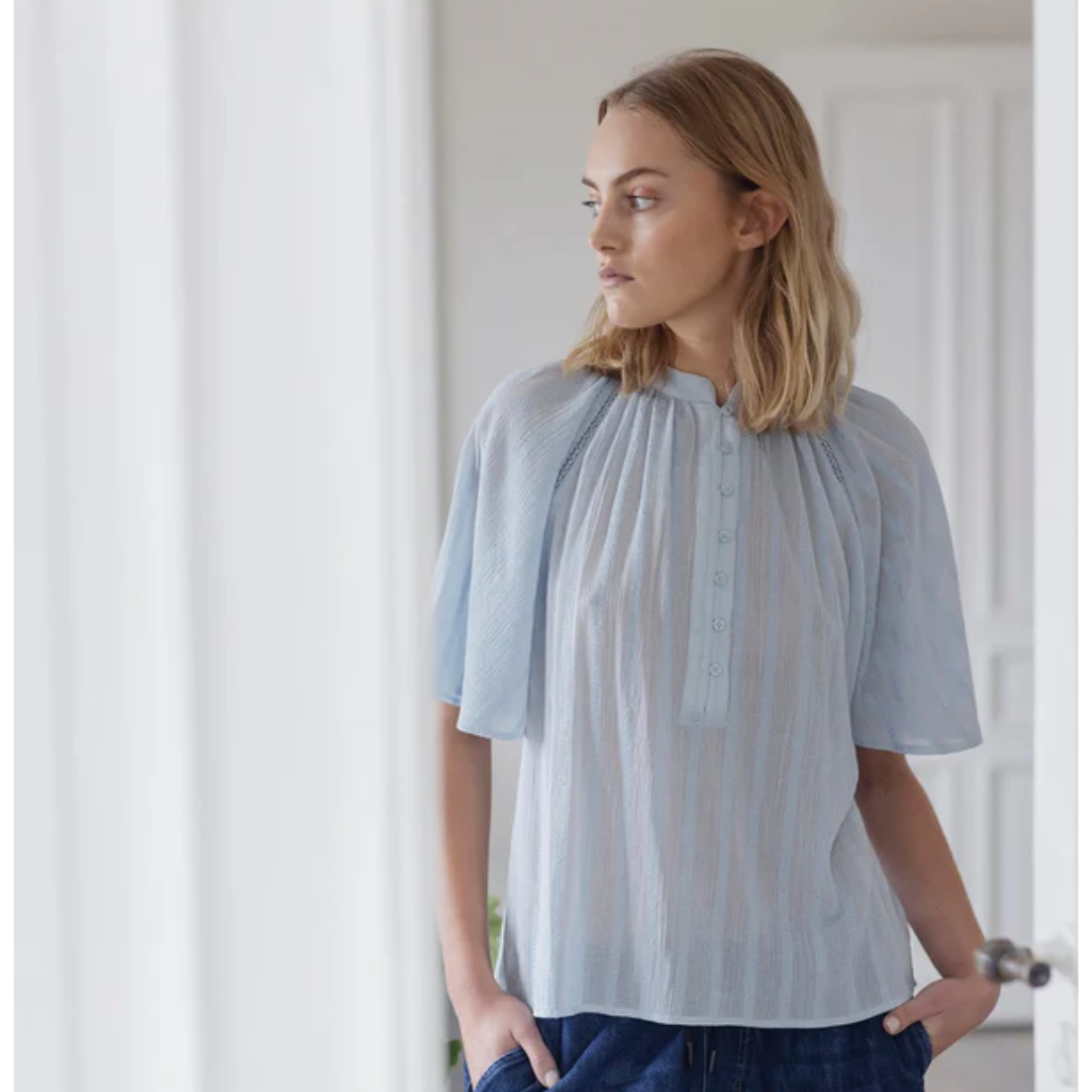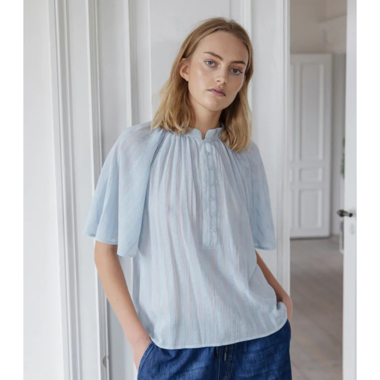 Blusen er designet med korte, flagrende ærmer og et løs A-snit.