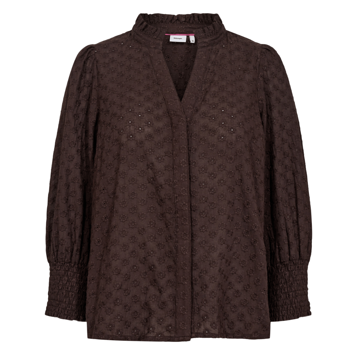 Stylenavn: NuSalvie Shirt Stylenummer: 705884 Farve: Black Coffee 5698 Materiale: 100% bomuld Vaskeanvisning: Skånevask max 30º