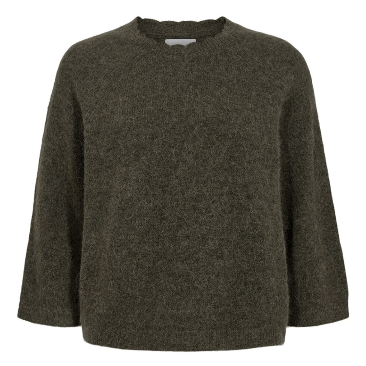 Strikken er meget klassisk med rund hals, 3/4 lange ærmer med vidde og en løs pasform.