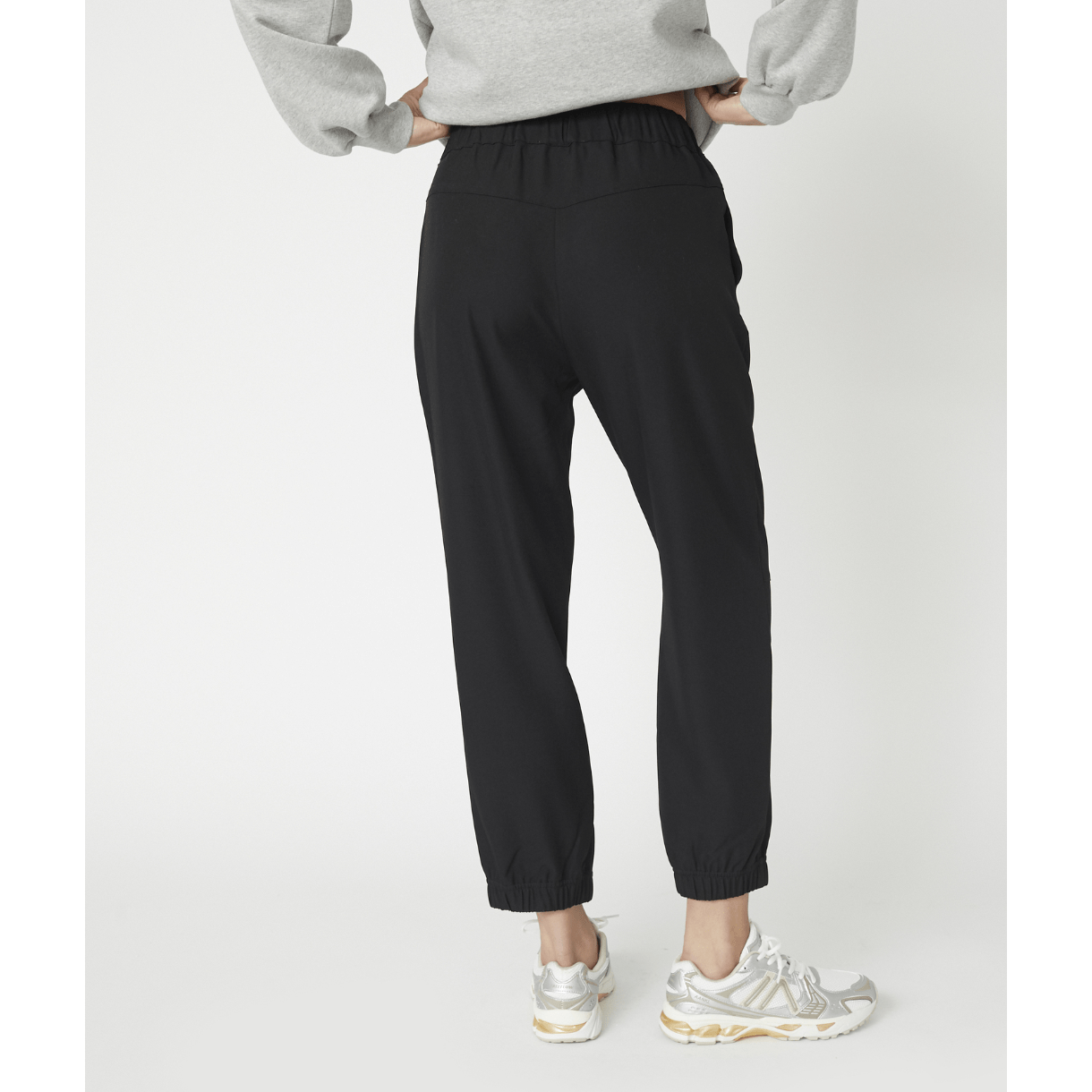 Bukserne har løse ben med tapered form og bred elastik nederst.
