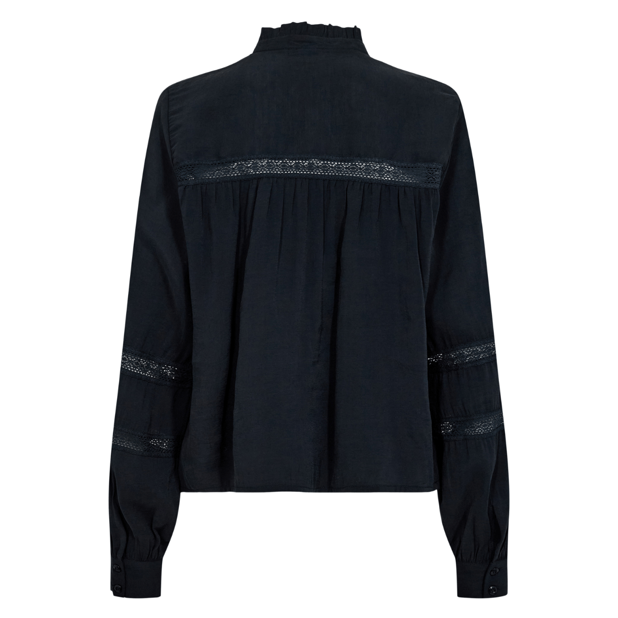 Flotte detaljer som lille flæsekant ved halsåbning, blomsterknap øverst og fine blondeindsatser rund på skjorten.