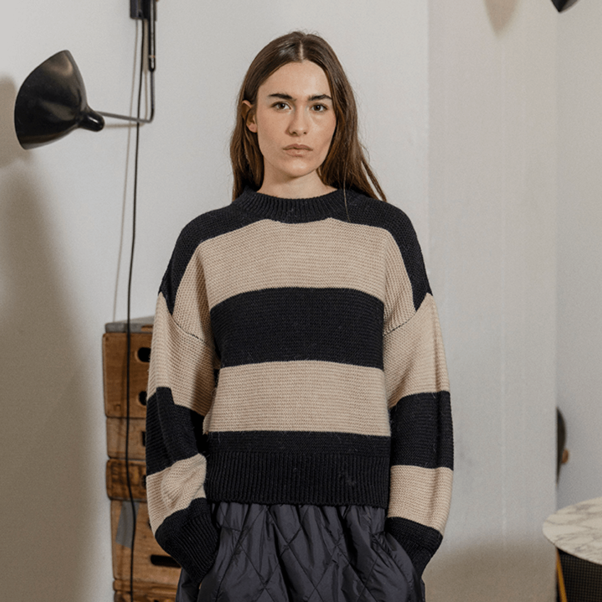 Strikken er med lange ærmer, rund hals og løs pasform.