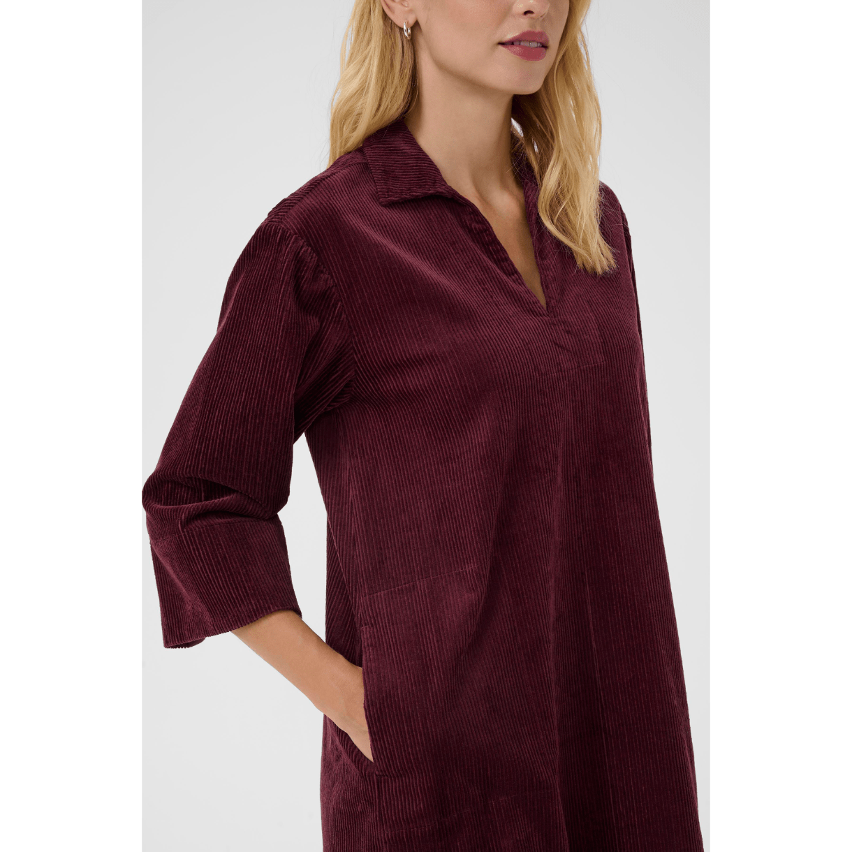 Kjolen har skjortekrave, V-udskæring og 3/4 lange ærmer med let vidde.