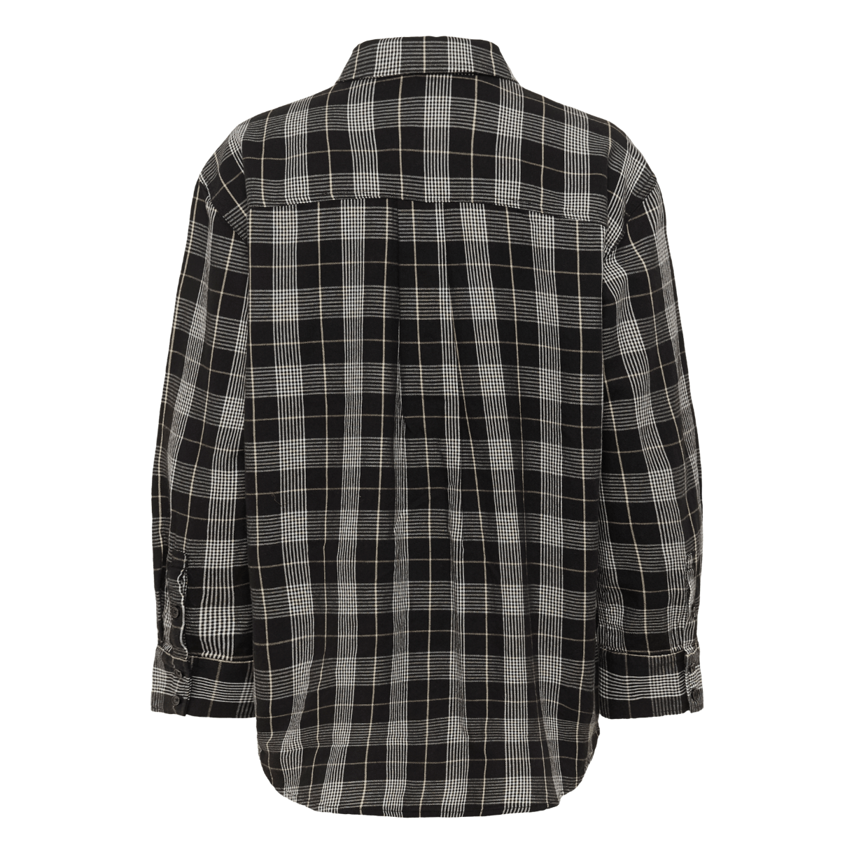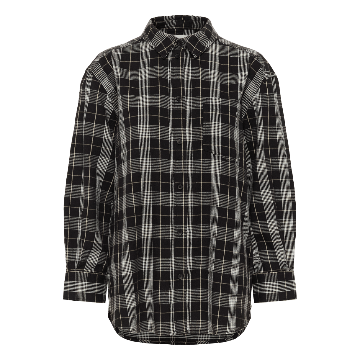 Skjorten har lange ærmer med manchet, knaplukning og skjortekrave.