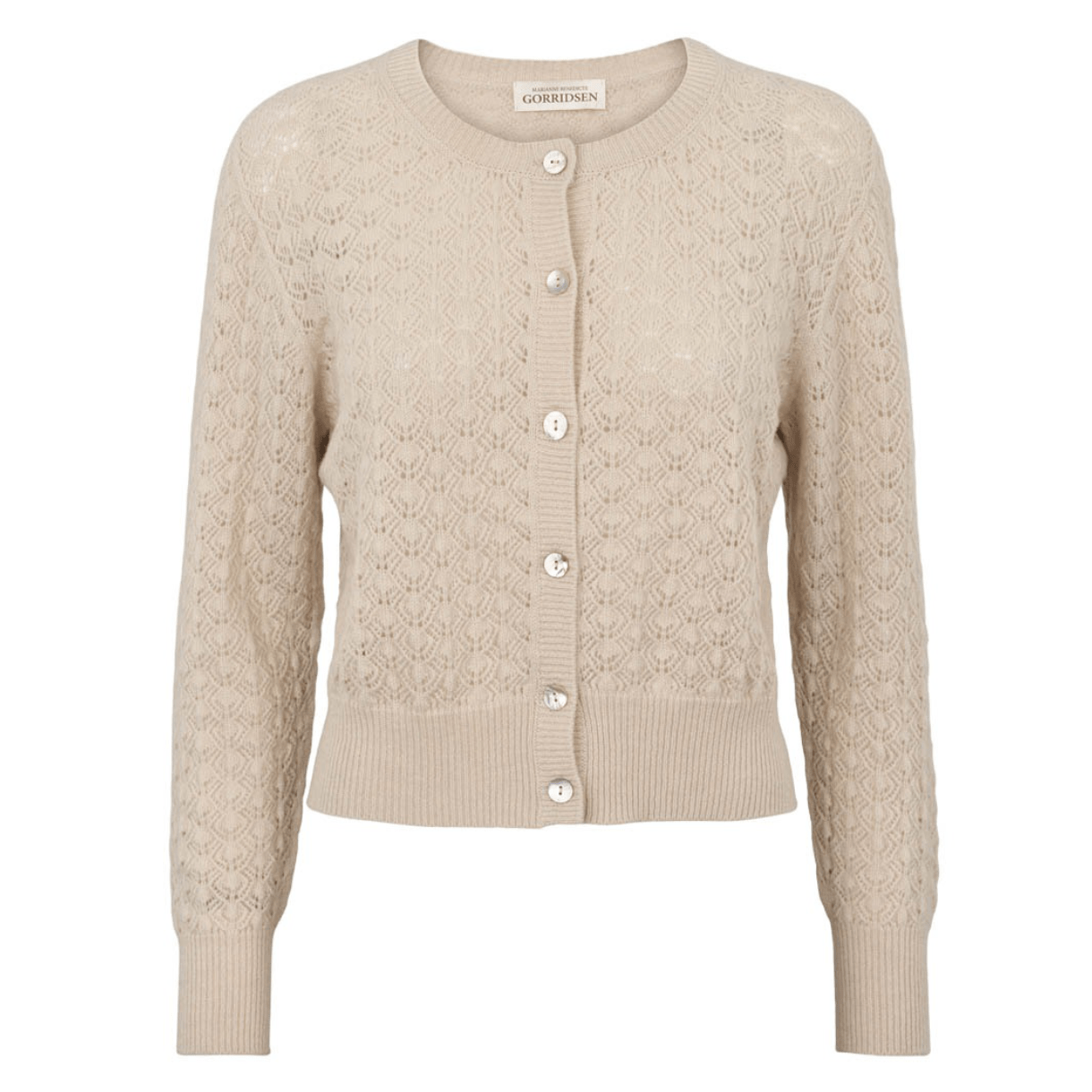 Meget smuk cardigan med hulmønster i delikat merino uld fra Gorridsen.