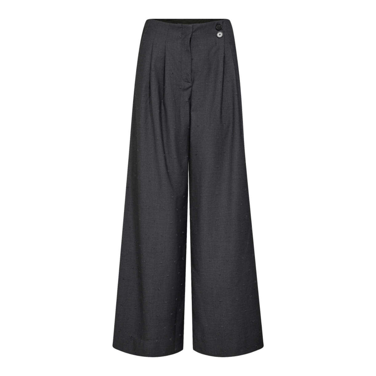 Bukserne er designet med høj talje, med læg og "slå-om effekt" med knapper i siden foran.