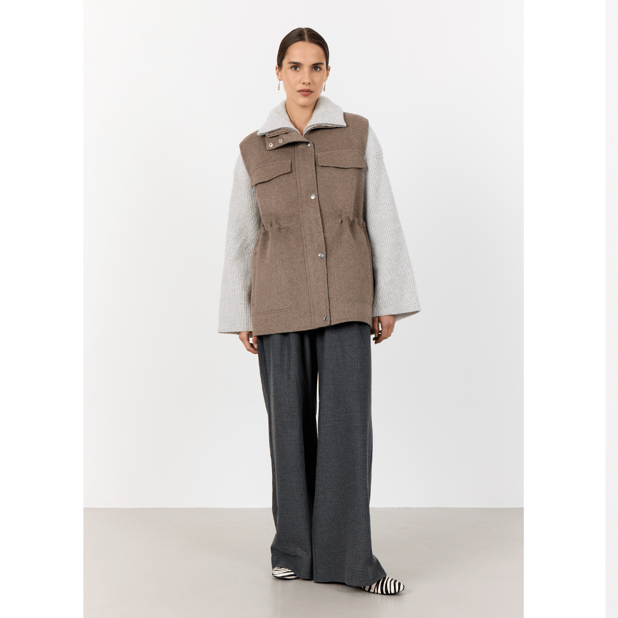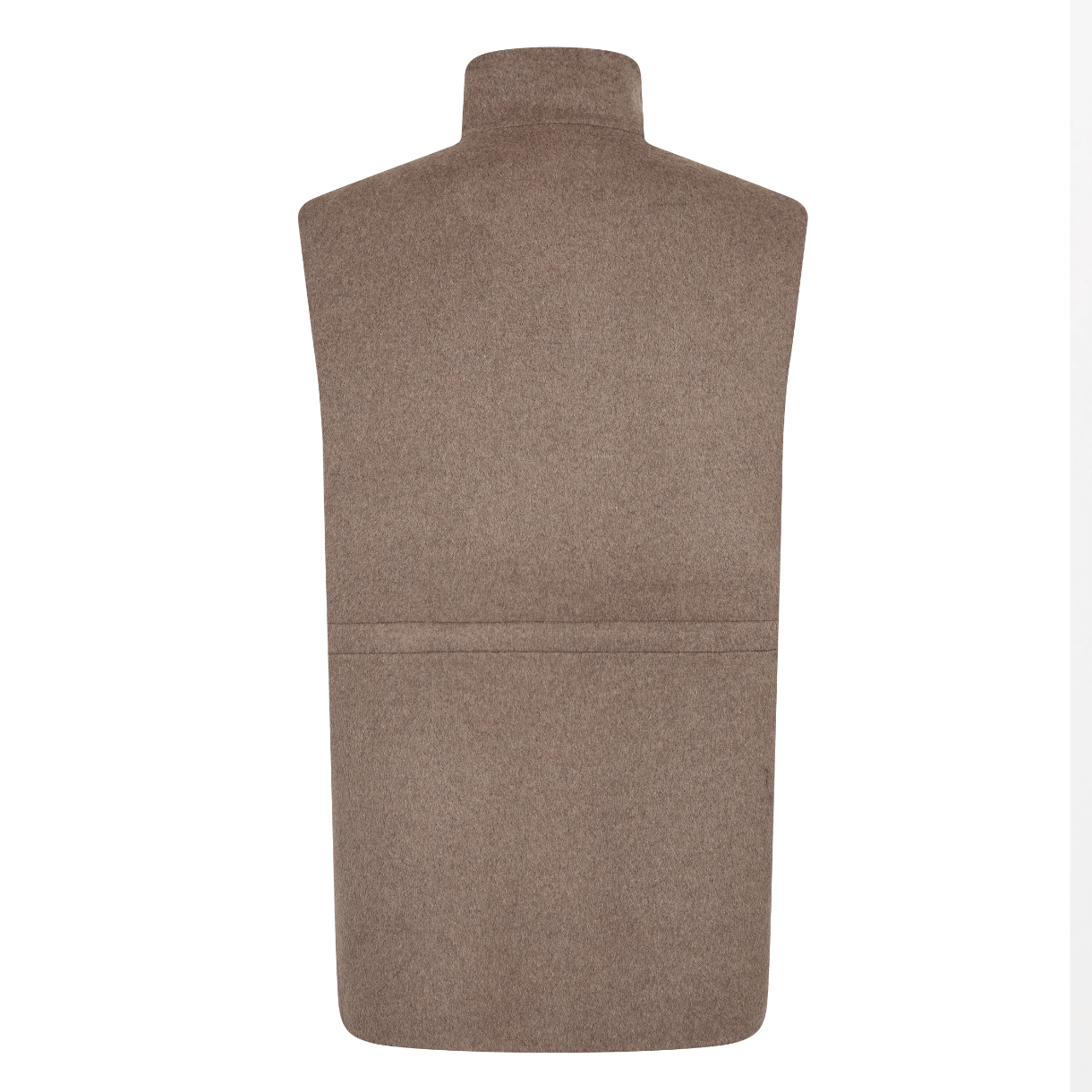 Vesten har en høj krave, trykknaplukning og to lommer foran, hvilket giver et rent og raffineret look.