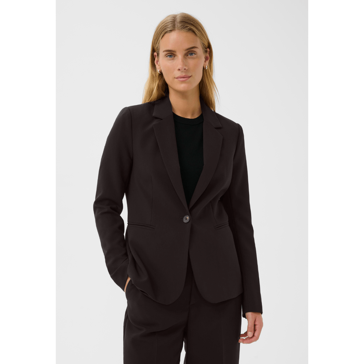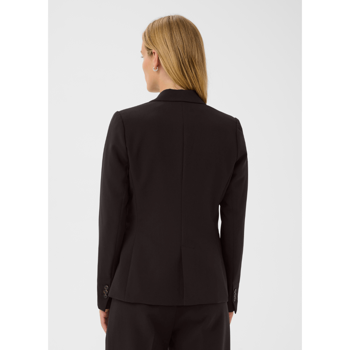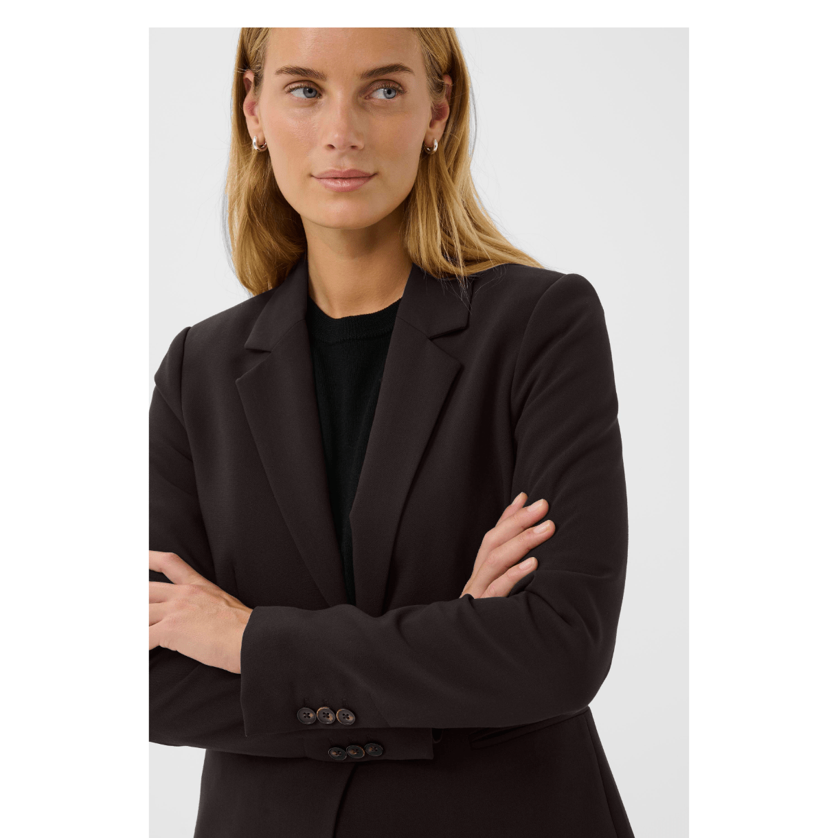 Den har knapper i manchet og lukkes med en enkelt knap.