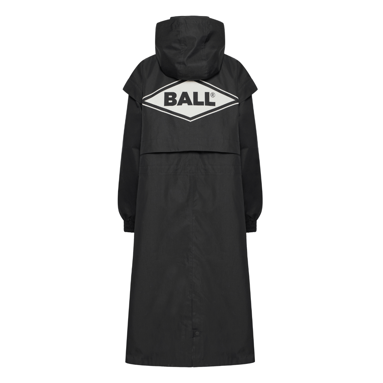 Frakke i midi længde med lynlås og knaplukning med "kappe" effekt på skuldre og ryg.