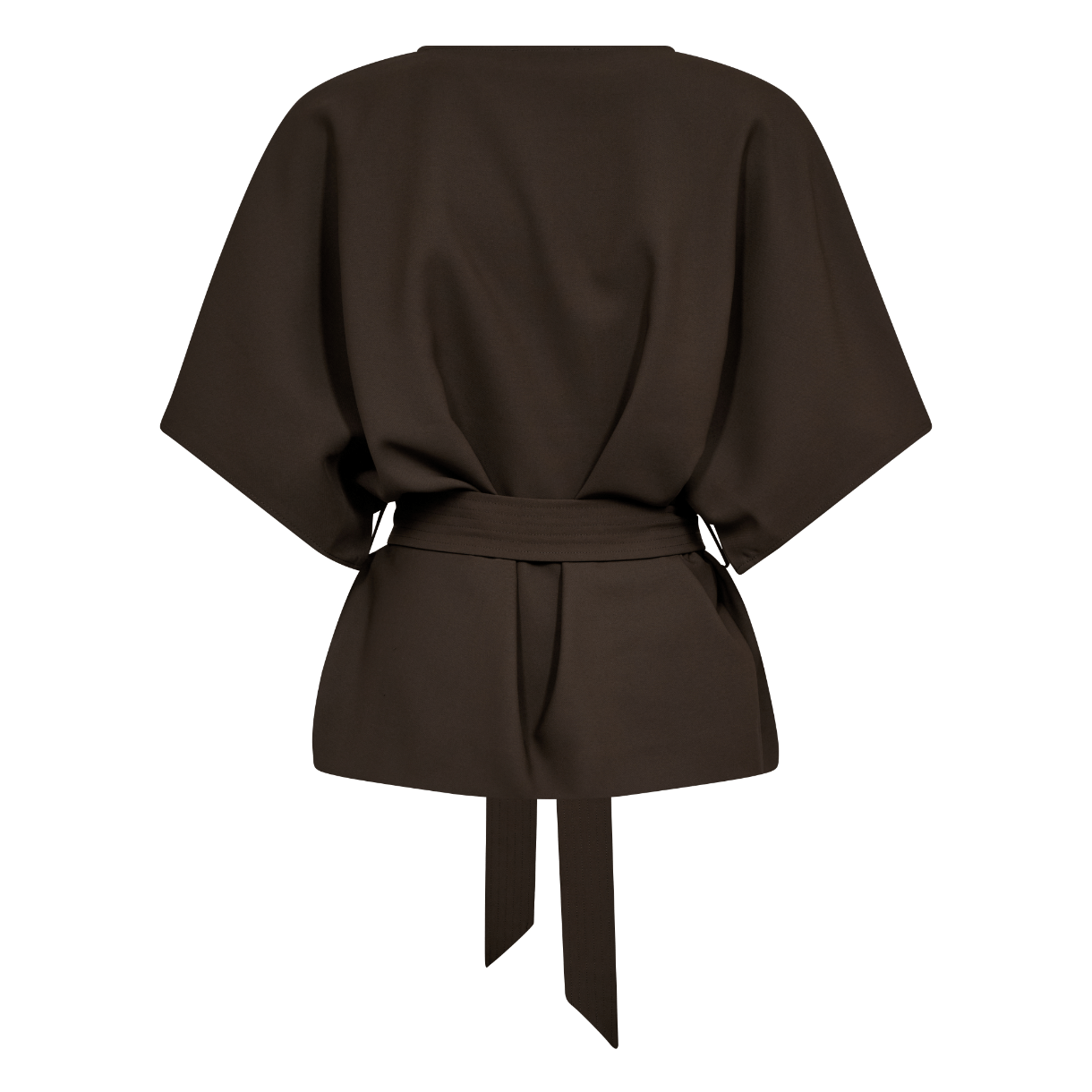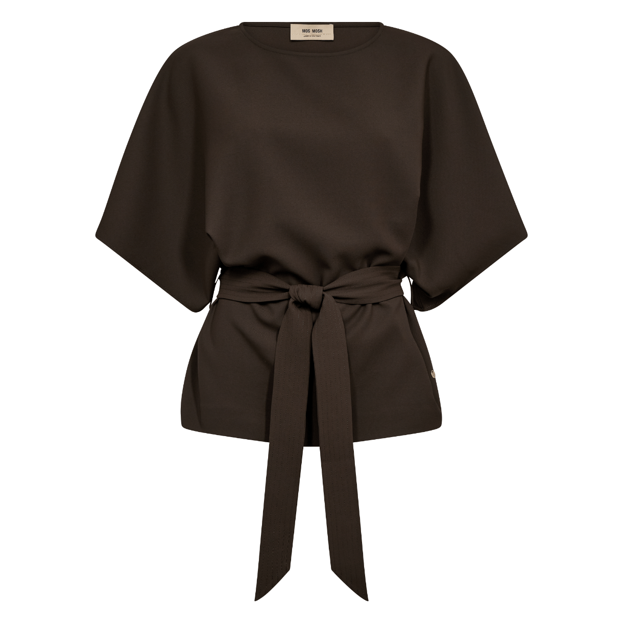 Blusen har brede flatterende sommerfugleærmer og matchende bindebånd om taljen.