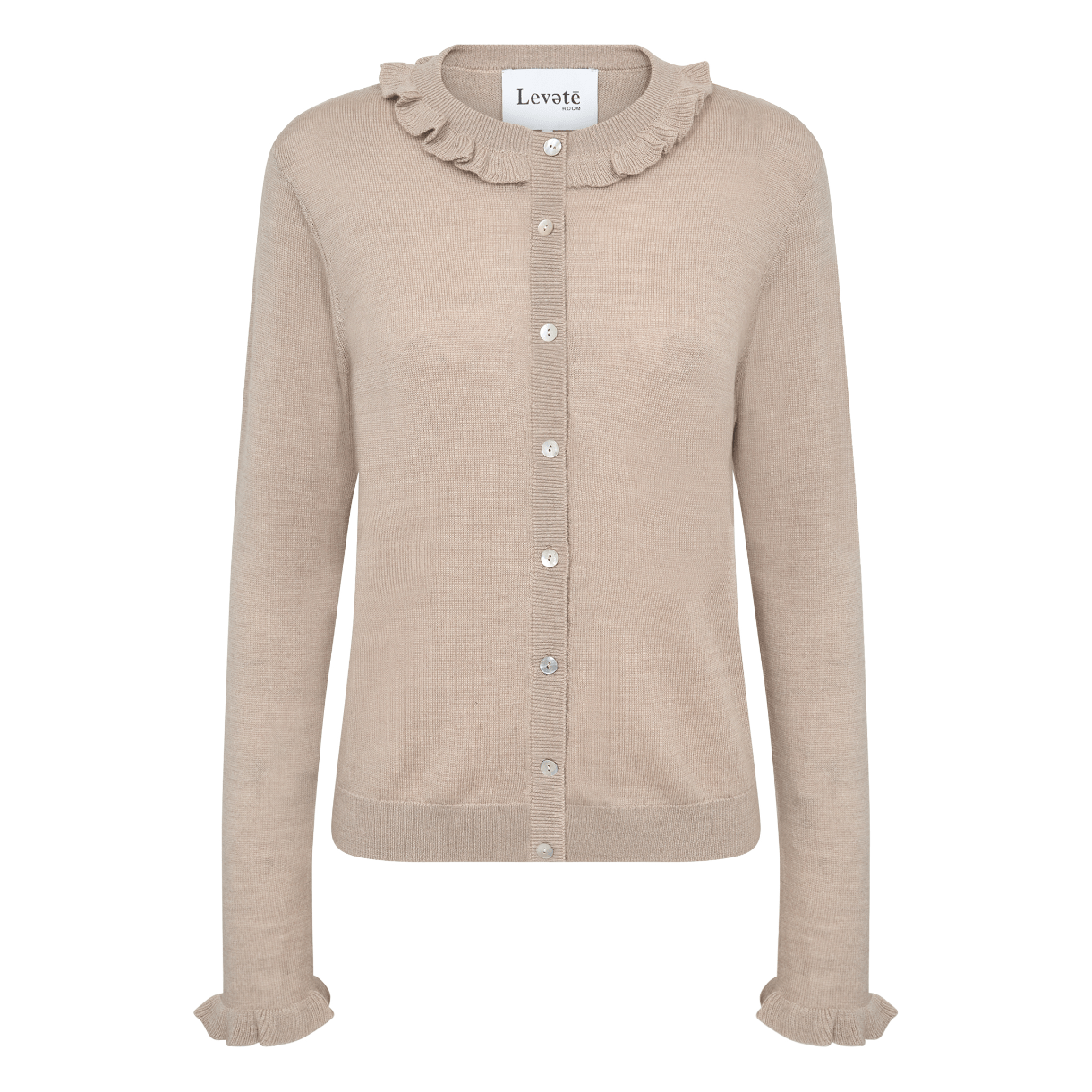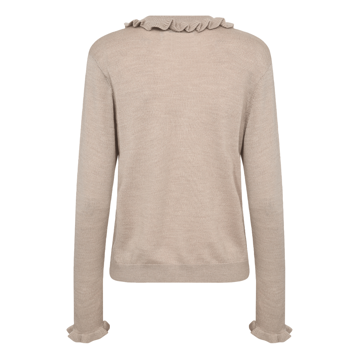 Strikken har krave med flæse, lange ærmer ligeledes med flæse og rund hals.