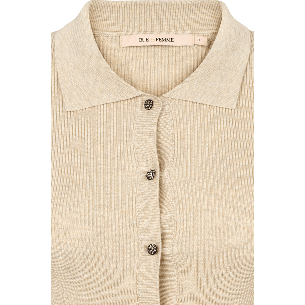 Polokrave og fine, glimtende knapper der giver et feminint touch.