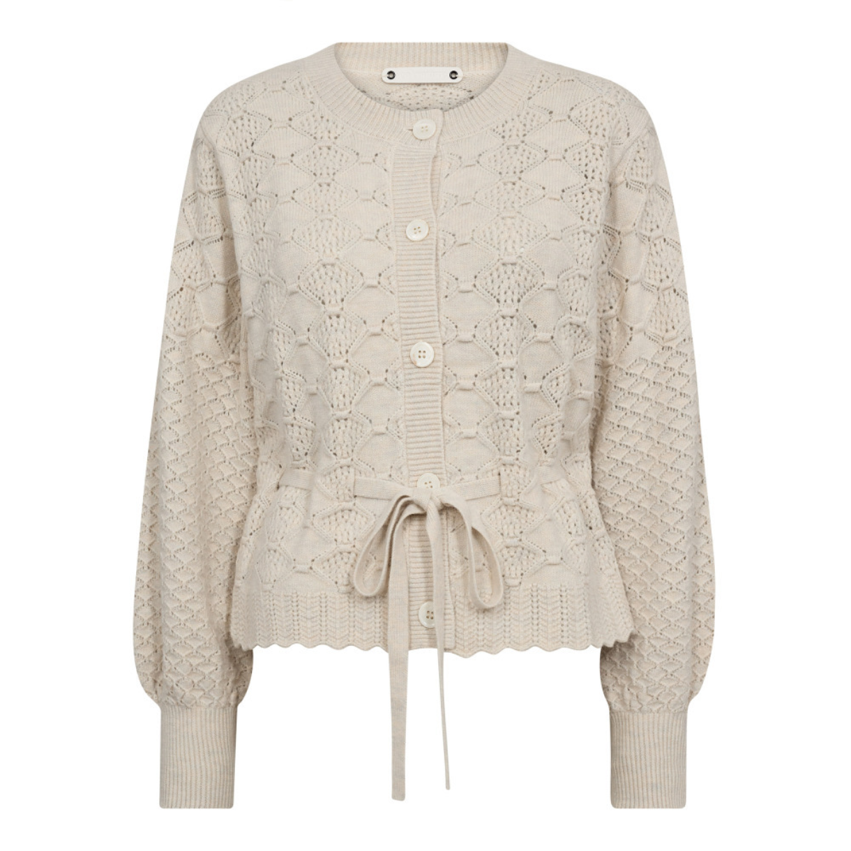 Stylenavn: RowCC Pointelle Tie Cardigan Stylenummer: 32241 Farve: Ivory 4021 Materiale: 64% Acrylic, 26% Polyester, 10% Polaymid Vaskeanvisning: Skånevask max 30º Størrelsessvarende: Ja