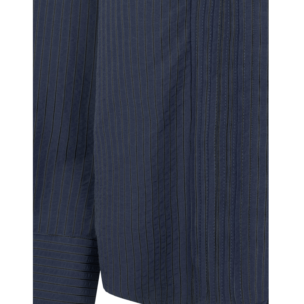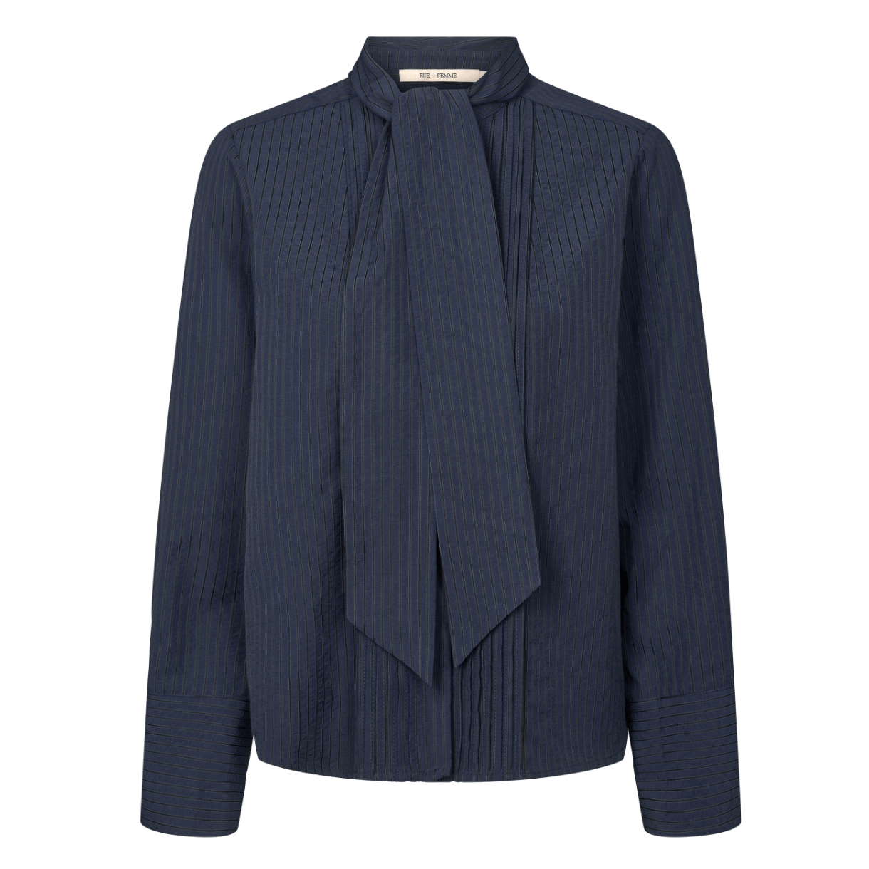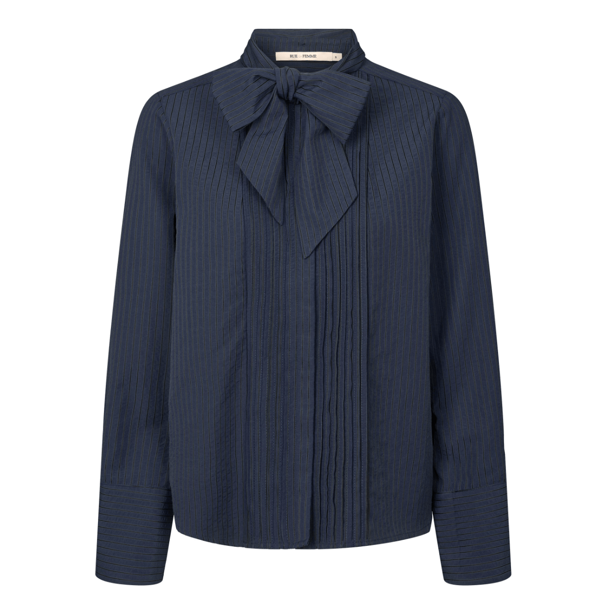 Skjorten har fine læg foran, lange ærmer med høje manchetter og en aftagelig sløjfe i kraven.
