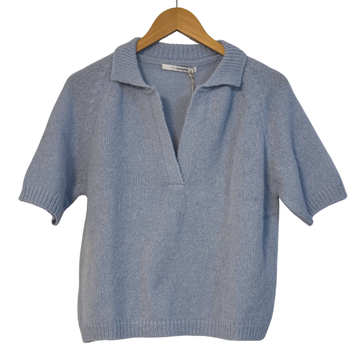 Strikken er designet med korte ærmer og med polokrave samt lille V-udskæring.