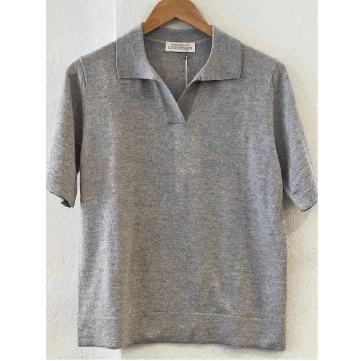 Strikken er med korte ærmer, krave og v-udskæring.