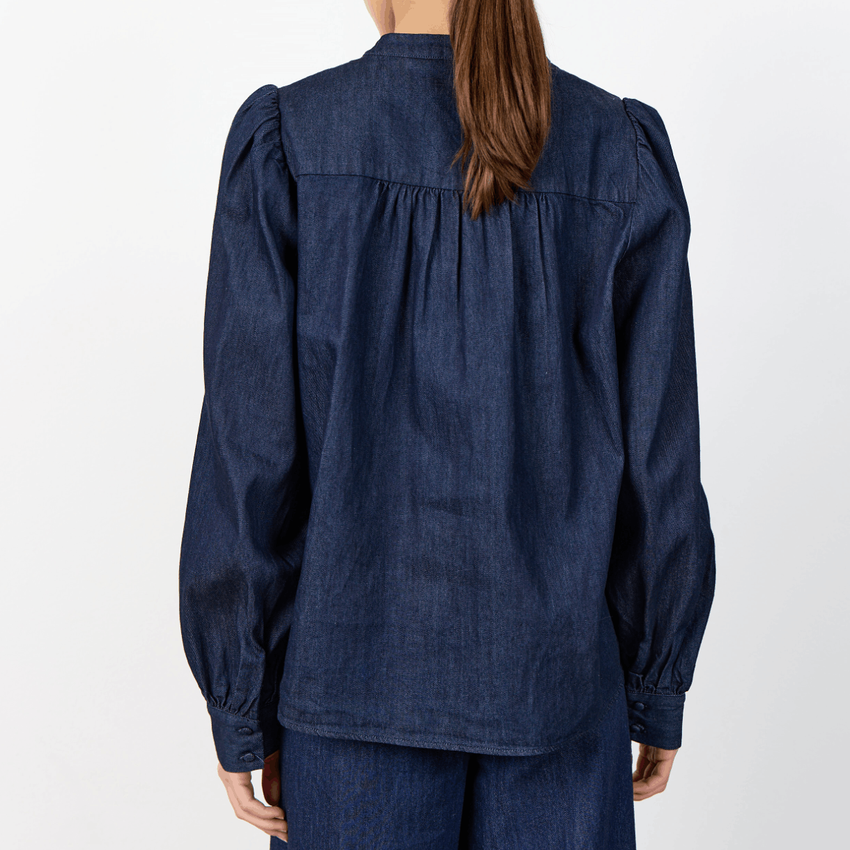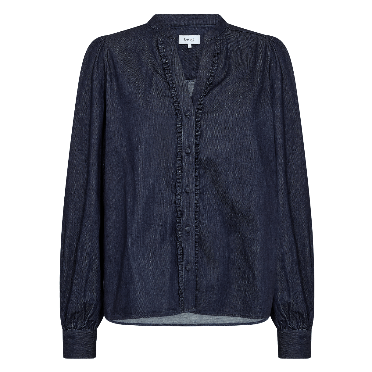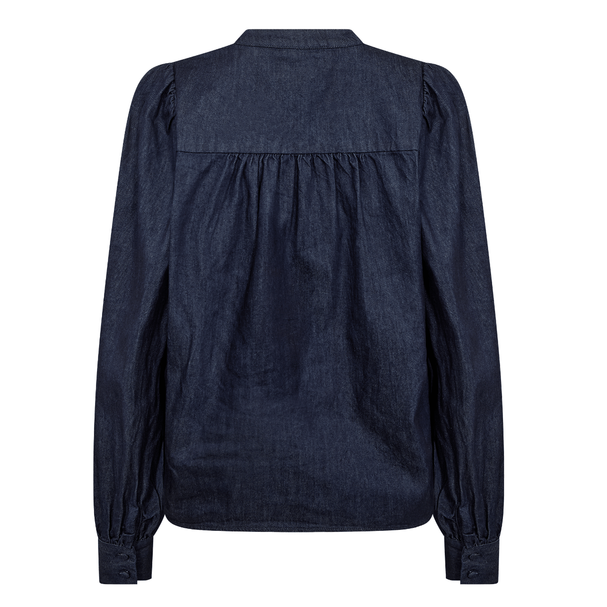 Skjorten har en lille flæsekrave, lukkes med fine stofbetrukne knapper og lange ærmer.