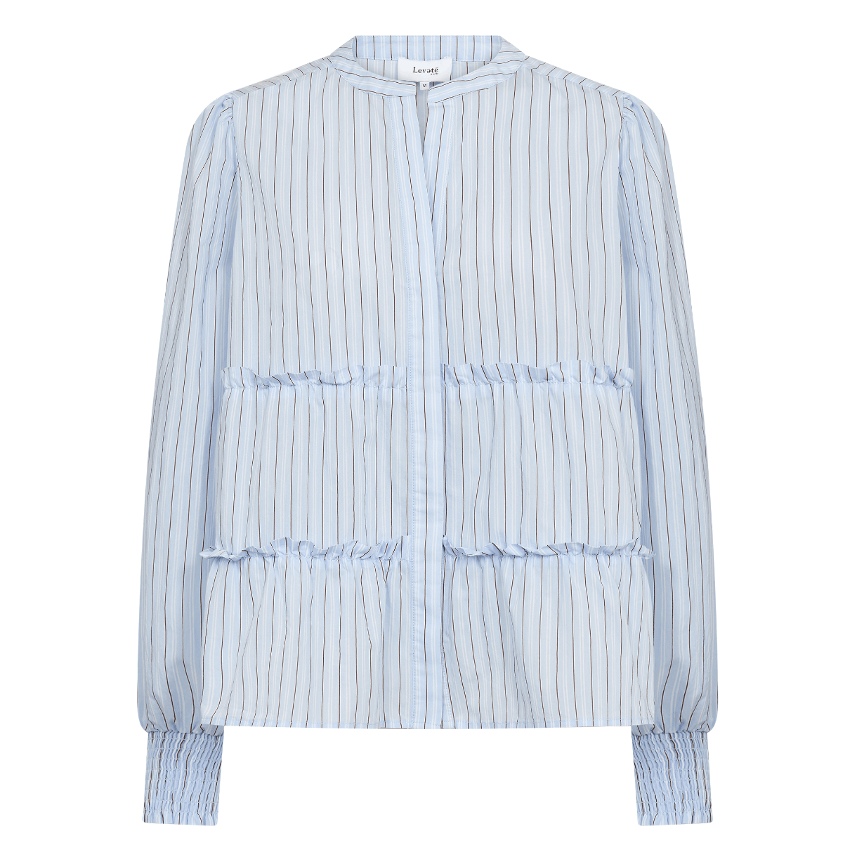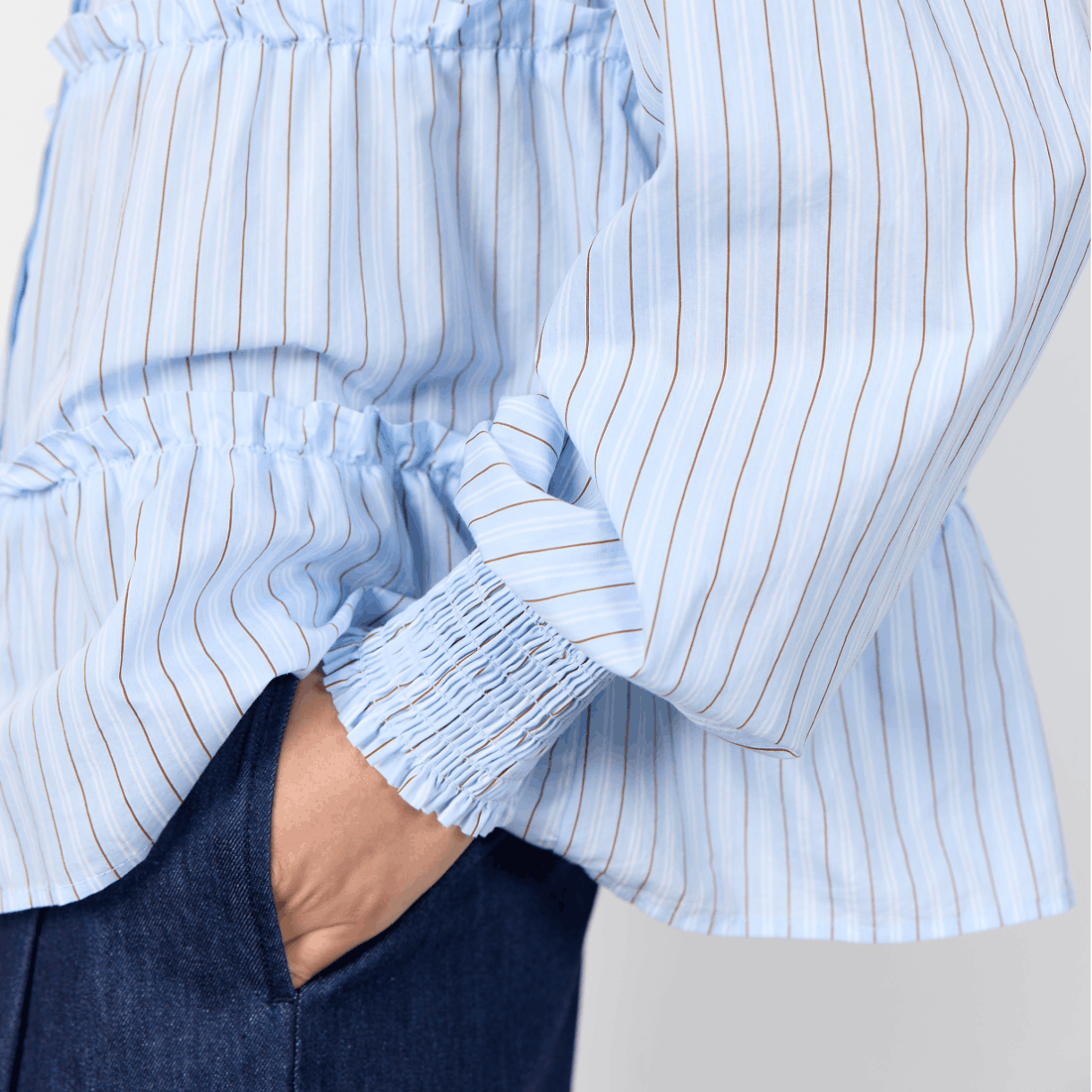 Skjorten har en lille mandarinkrave, skjult knaplukning og lange ærmer med smock.