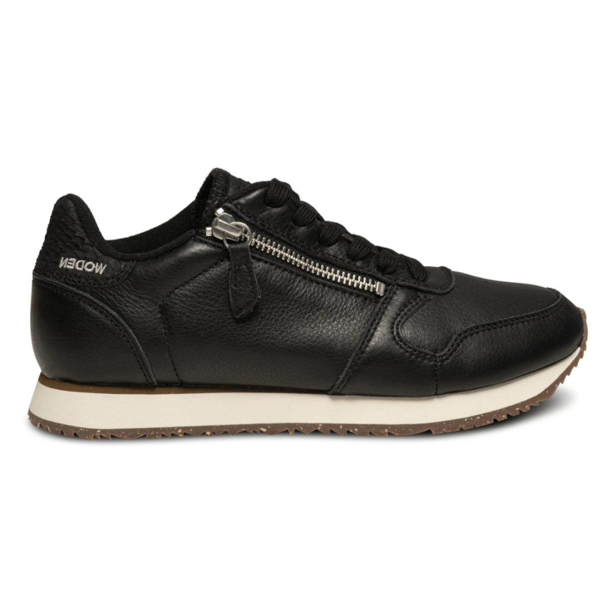 Smart sneaker i sort læder med detaljer i fiskelæder fra Woden og en fuldt funktionel lynlås.