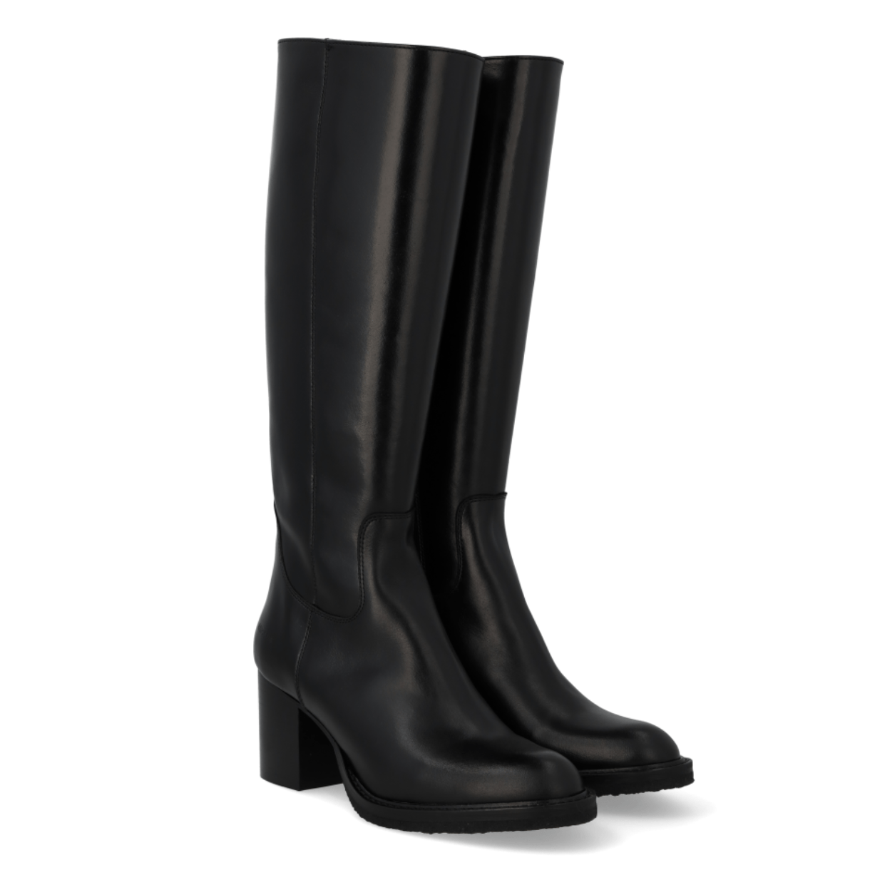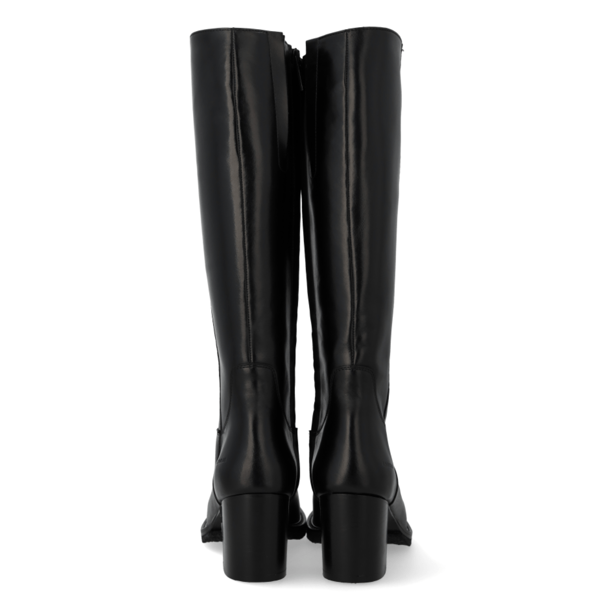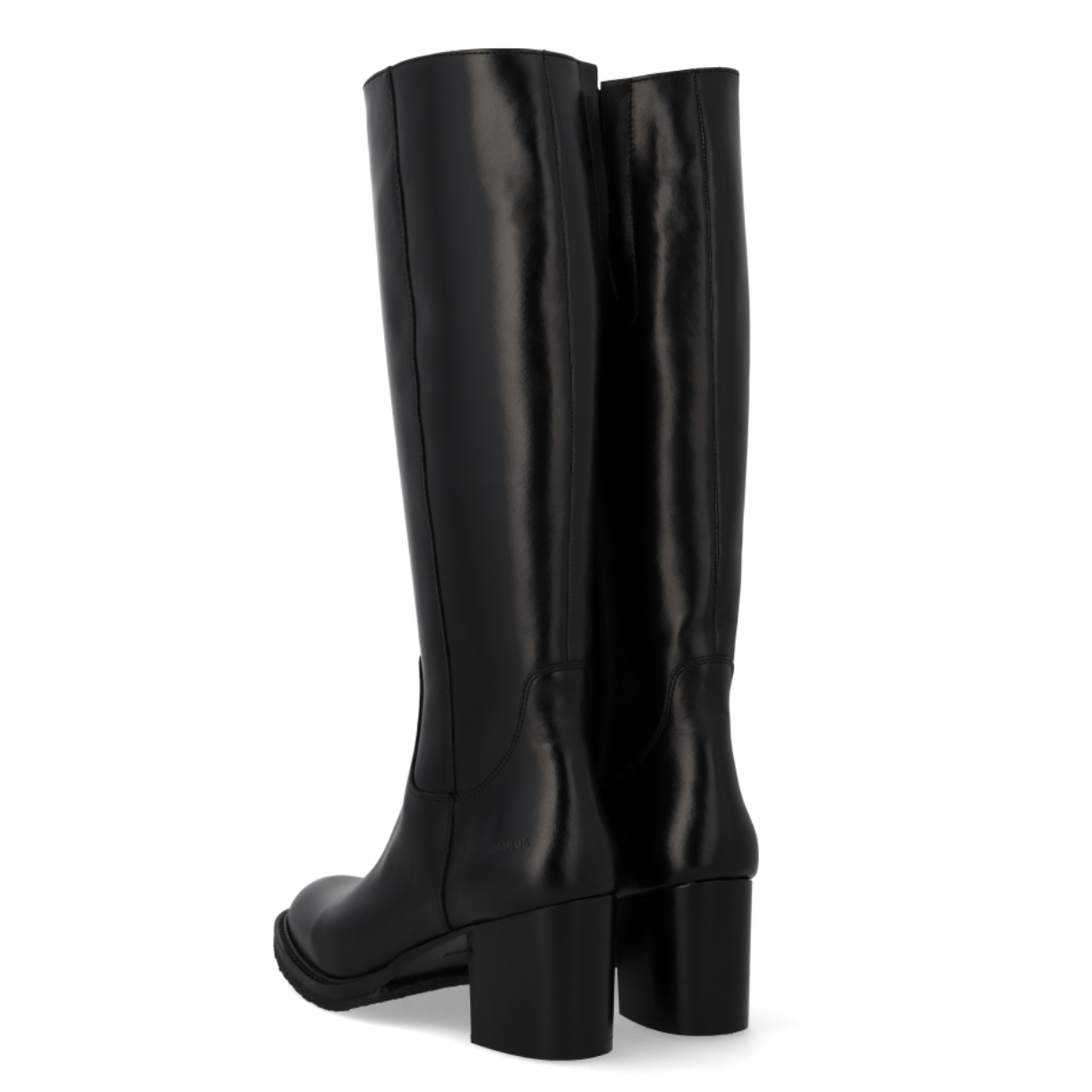 Stylenavn: Langskaftet støvle på blokhæl Stylenummer: 7696-102-8470 Farve: Black 1835 Materiale: 100% skind. Sål af rågummi. Pasform: Normal fit.