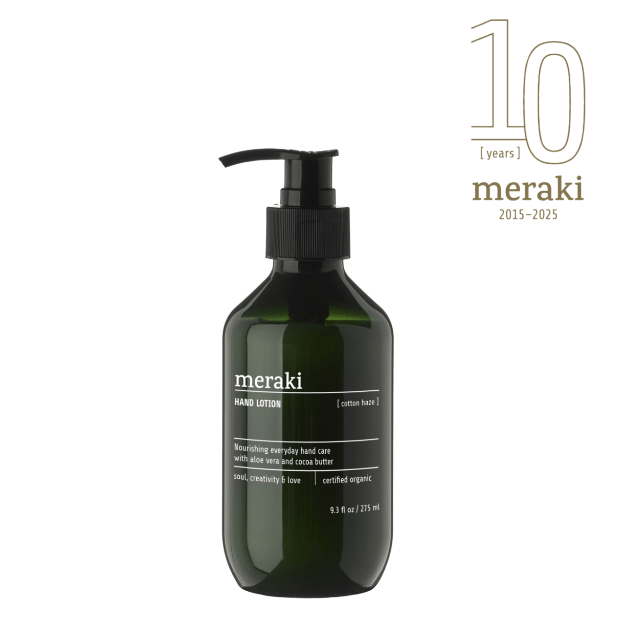 Skøn og meget fugtgivende økologisk hånd lotion til tør hud med duften Cotton Haze fra Meraki.